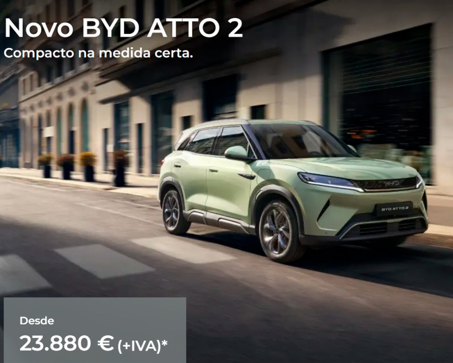 *PVP referente ao modelo BYD ATTO 2 versão Active, em vigor até 31/12/2025 nos concessionários BYD aderentes e limitado ao stock existente. Valor não inclui despesas de legalização e transporte nem custos adicionais de pintura. Acresce IVA à taxa legal em vigor. Imagem não contratual. WLTP: Consumo de energia em kWh/100 km (combinado): 16; Autonomia Elétrica em km (combinado-urbano): 312-463. Emissões de CO2 em g/km: 0.