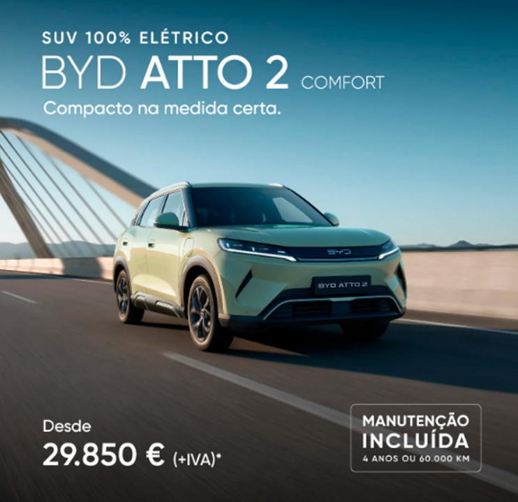 *PVP referente ao modelo BYD ATTO 2 versão Comfort, em vigor até 30/04/2026 nos concessionários BYD aderentes e limitado ao stock existente. Valor não inclui despesas de legalização e transporte nem custos adicionais de pintura. Acresce IVA à taxa legal em vigor. Imagem não contratual. WLTP: Consumo de energia em kWh/100 km (combinado): 17,4; Autonomia Elétrica em km (combinado-urbano): 430-604. Emissões de CO2 em g/km: 0.