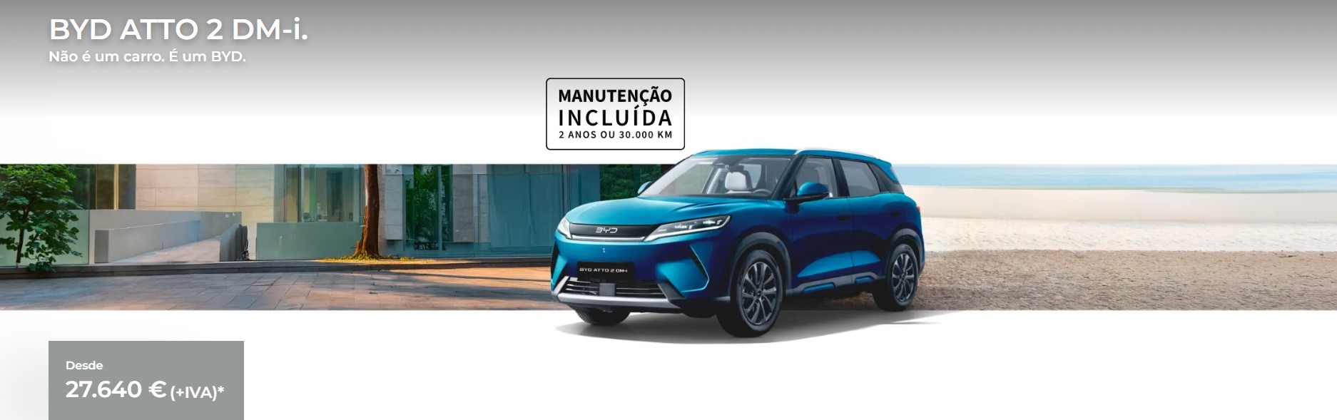 *PVP referente ao modelo BYD ATTO 2 DM-i versão Boost, em vigor até 30/04/2026 nos concessionários BYD aderentes e limitado ao stock existente. Valor não inclui despesas de legalização e transporte nem custos adicionais de pintura. Acresce IVA à taxa legal em vigor. Imagem não contratual. WLTP: Consumo de energia em ciclo combinado (kWh/100 km): 15,8; Consumo de combustível em ciclo combinado (l/100 km): 5,1; Consumo ponderado em ciclo combinado (l/100 km): 1,8; Autonomia elétrica em ciclo combinado (km): 90; Autonomia total (elétrico + combustível): 1000 km; Emissões de CO2 em ciclo combinado (g/km): 41.