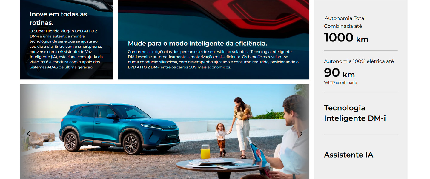 O novo BYD ATTO 2 DM‑i adapta‑se à sua vida como nenhum outro no segmento. A revolucionária Tecnologia DM‑i transforma‑o no melhor SUV em termos de custo‑benefício, ao combinar de forma eficiente baixos consumos com uma elevada autonomia total combinada de até 1000 km. Descubra‑o desde 27.640 € (+ IVA) com Manutenção Incluída**.