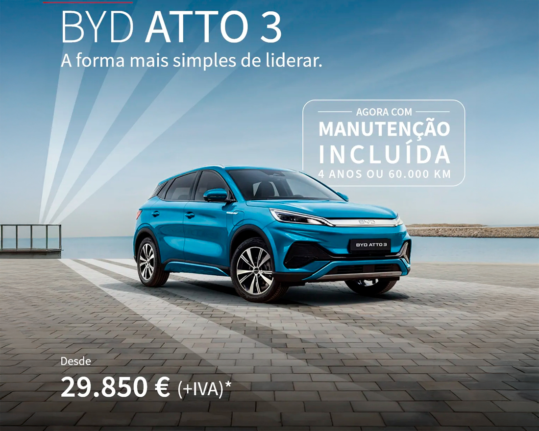 *PVP referente ao modelo BYD ATTO 3 2025 versão Comfort, em vigor até 31/12/2025 nos concessionários BYD aderentes e limitado ao stock existente. Valor não inclui despesas de legalização, transporte e custos adicionais de opção de pintura. Acresce IVA à taxa legal em vigor. Imagem não contratual. WLTP: Consumo de energia em kWh/100 km (combinado): 16; Autonomia Elétrica em km (combinado-urbano) 420-565. Emissões de CO2 em g/km: 0.