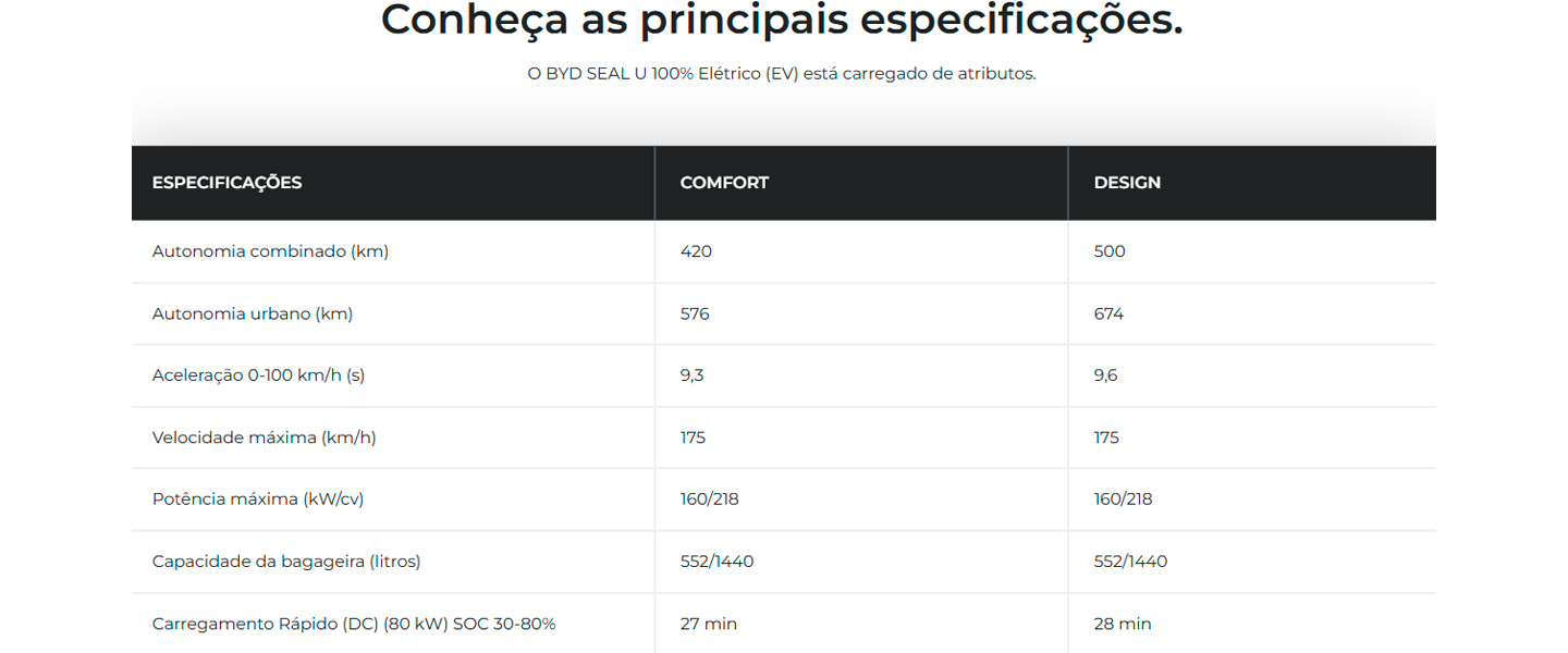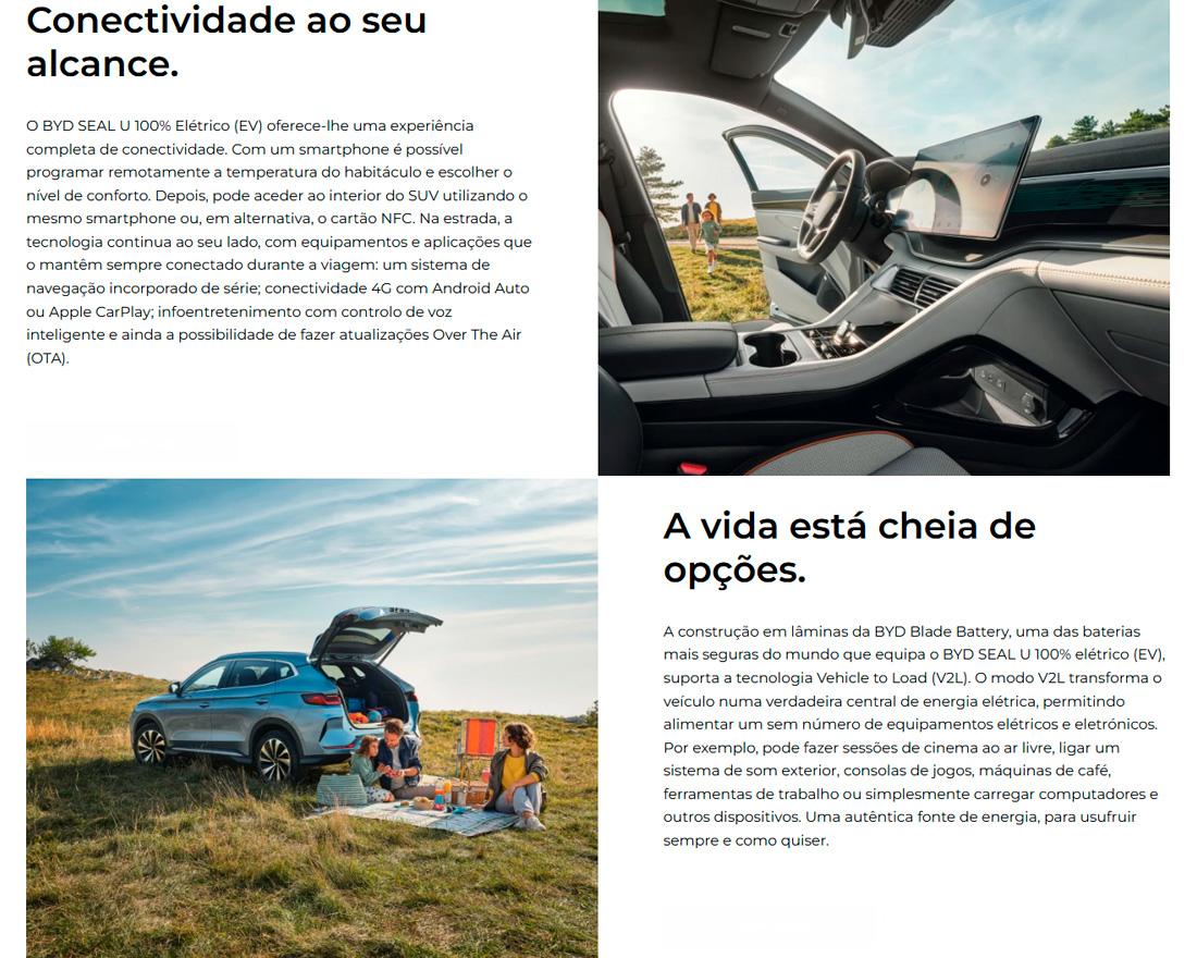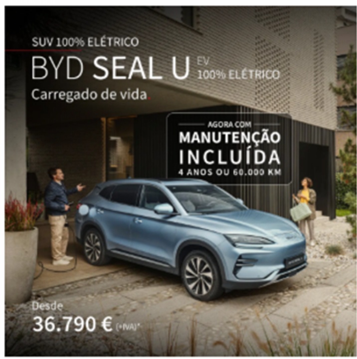 *PVP referente ao modelo BYD SEAL U versão Comfort, em vigor até 30/04/2026 nos concessionários BYD aderentes e limitado ao stock existente. Valor não inclui despesas de legalização e transporte nem custos adicionais de opção de pintura. Acresce IVA à taxa legal em vigor. Imagem não contratual. WLTP: Consumo de energia em kWh/100 km (combinado): 19,9; Autonomia Elétrica em km (combinado-urbano): 420-576. Emissões de CO2 em g/km: 0.