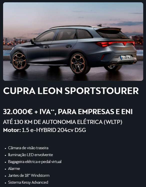 ** Campanha válida para Empresas e ENI - negócios fechados - até 30/04/2026 e limitada ao stock existente. Valor para CUPRA Leon Sportstourer 1.5 e-Hybrid DSG 204cv. Consumo combustível combinado WLTP (l/100km):1,3 – 1,5. Consumo elétrico combinado WLTP (kWh/100km): 13,0 – 13,4. Emissões CO2 WLTP (g/km): 29 - 34. Imagem não contratual.