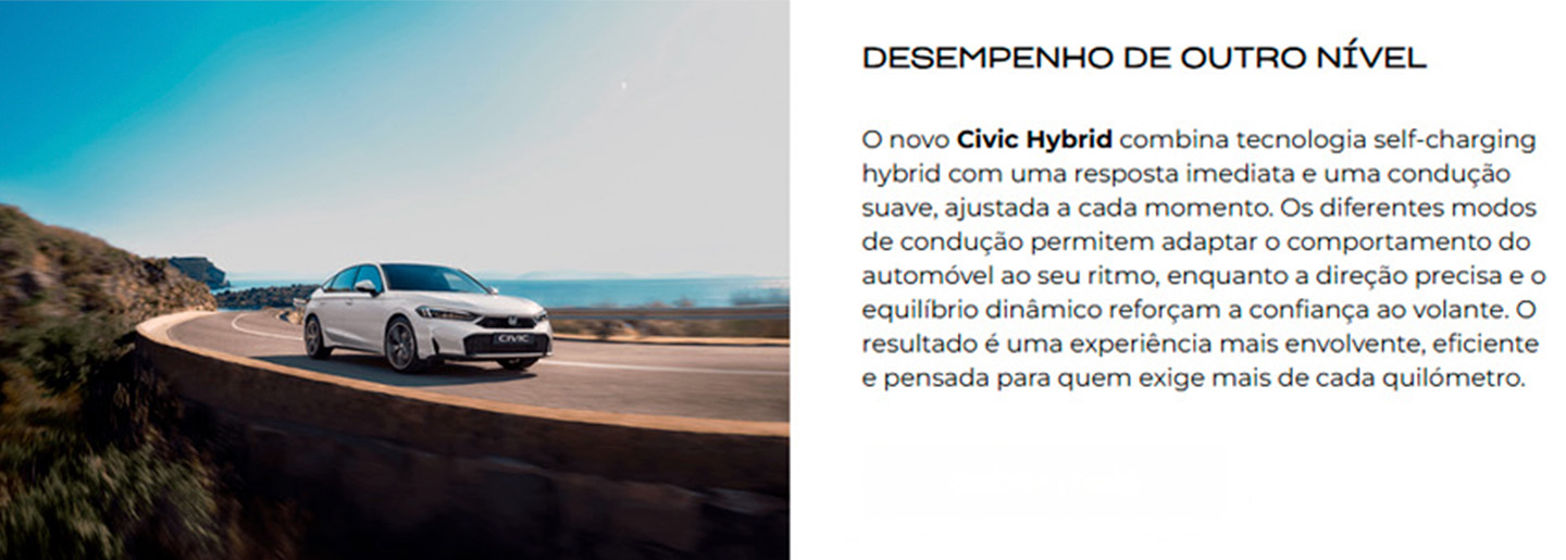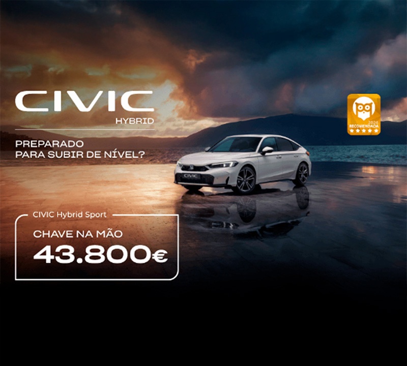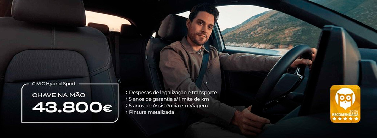 *Preço chave na mão referente ao modelo Honda Civic e:HEV Sport, incluindo despesas de legalização, transporte, pintura metalizada e ecovalor. Limitado ao stock existente nos concessionários aderentes no continente. Para as ilhas, acresce o custo de transporte marítimo. Imagem não contratual. Condições válidas para unidades em stock abrangidas pela campanha até 28 de abril de 2026. Consumos em ciclo combinado (l/100 km): 5 L. Emissões CO2 (g/km): 113.
