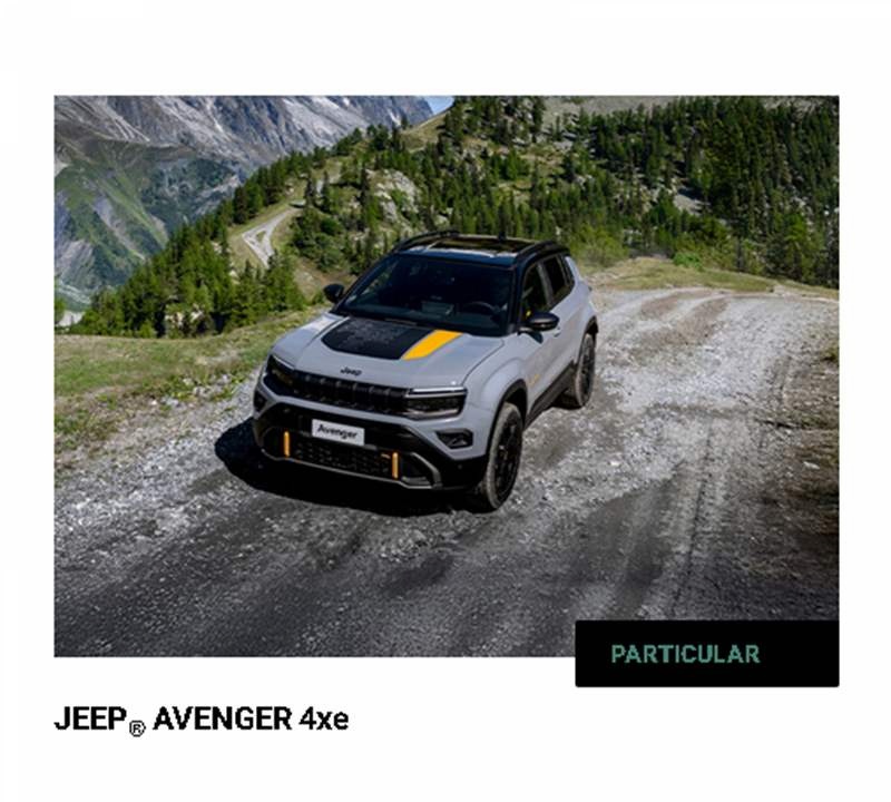 Termos legais: Contrato de crédito automóvel novos para 36 meses / 30.000 km, exemplo para Avenger 4XE The North Face Edition - 1.2 Turbo 4xe 145CV AT, PVPR de 42.253,00€, PVP campanha de 34.253,00€, inclui DLTP , entrada inicial de 8.290€, montante financiado de 25.963,00€, 35 prestações de 199€, prestação final de 22.485,63€, taxa fixa, TAN de 4,620% e TAEG de 6,9% para um MTIC de 30.718,23€ (Inclui comissão de abertura de contrato de 700€, de reconhecimento e envio da declaração de extinção de reserva de 75€ e 32,50€ de custo de extinção de reserva). Condições válidas até 30/06/2026, para clientes particulares. Financiado por Stellantis Financial Services, uma marca Santander Consumer Finance, S.A, Sucursal em Portugal (registado junto do BdP com o nº 0073). A FCA Portugal, S.A. registada no Banco de Portugal sob o nº 7205 como intermediário de crédito a título acessório, actua sem caracter de exclusividade. *Valor Final Garantido, condicionado ao cumprimento de condições. Limitado ao stock existente.Jeep® Avenger 4xe: Consumo de combustível:5,5 l/100 km; Emissões de CO2: 124 g/km. Valores de homologação determinados com base no ciclo combinado WLTP. Os valores indicados são para efeitos comparativos. Os valores reais de consumo e CO2 dependem de muitos fatores associados, como, a título exemplificativo, mas não limitativo, o estilo de condução, o percurso, as condições meteorológicas, de estrada, para além do tipo de utilização e equipamento do veículo.