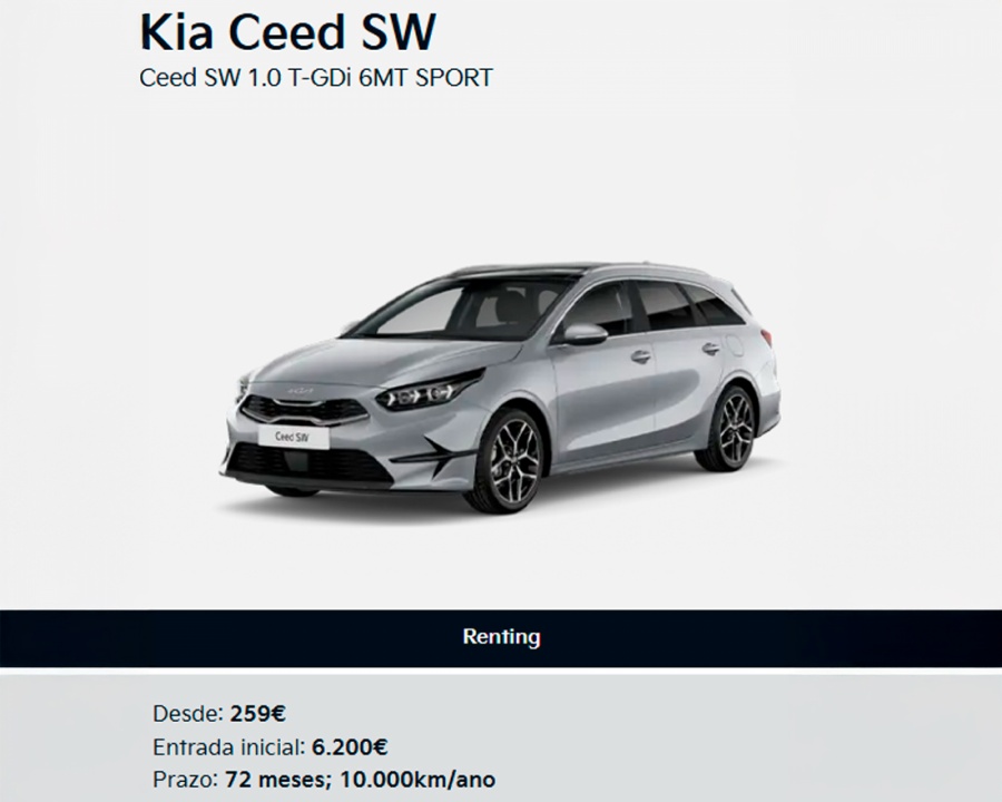 Kia Ceed SW 1.0 T-GDi 6MT Drive em Aluguer Operacional de Viaturas, prazo 72 Meses / 60.000km. Com entrada inicial de 6.200€ (IVA incluído) Inclui os serviços: Aluguer, IUC, IPO, Manutenção Plus, Assistência em viagem. Seguro não incluído, mas obrigatório, de danos próprios e Responsabilidade Civil (capital máximo €50.000.000) com direitos ressalvados à Locadora. Inclui despesas de preparação e legalização. Condições válidas até 31/12/2025 para clientes particulares, e limitada ao stock existente em Portugal Continental (para as ilhas acrescem custos de transporte) nos Concessionários Kia aderentes. Contrato KIA RENTING, condicionado à aprovação do Comité de Crédito da Arval Service Lease, SA. Imagens meramente ilustrativas. Consumo Combinado WLTP (l/100km): 5,7. Emissões CO2 WLTP (g/km): 129.