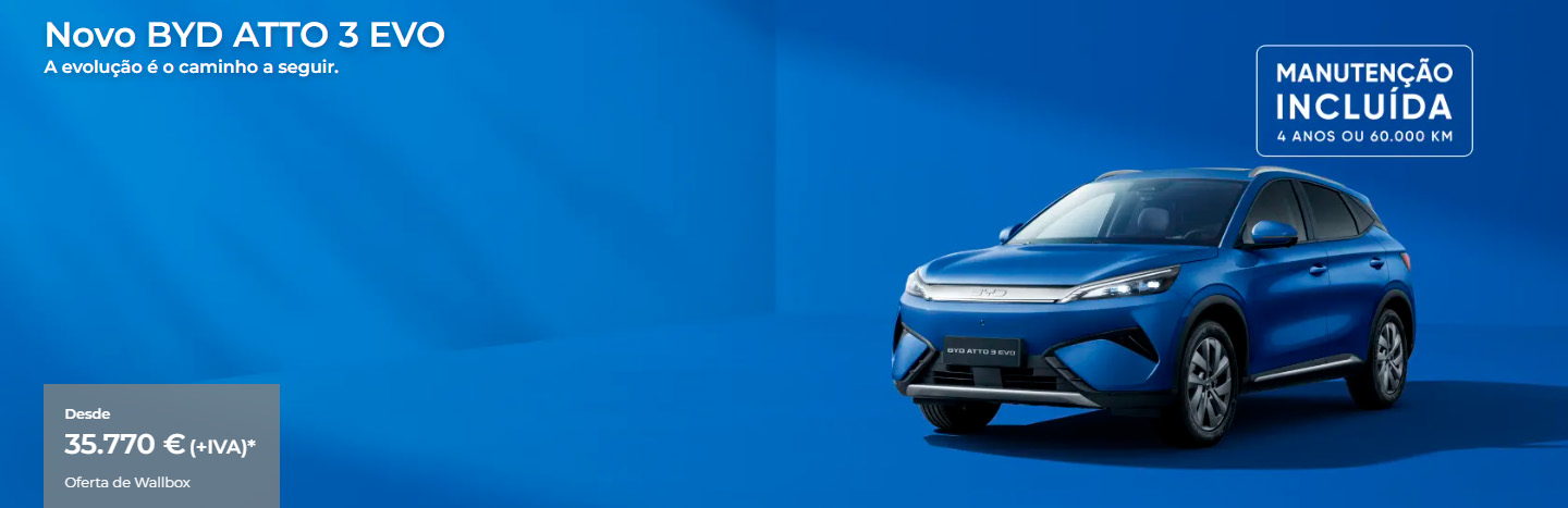 *PVP referente ao modelo BYD ATTO 3 EVO versão Design, em vigor até 30/04/2026 nos concessionários BYD aderentes e limitado ao stock existente. Valor não inclui despesas de legalização e transporte nem custos adicionais de pintura. Acresce IVA à taxa legal em vigor. Imagem não contratual. A oferta não inclui montagem e instalação de Wallbox. WLTP: Consumo de energia em kWh/100 km (combinado): 16,4; Autonomia Elétrica em km (combinado-urbano): 510-710. Emissões de CO2 em g/km: 0.