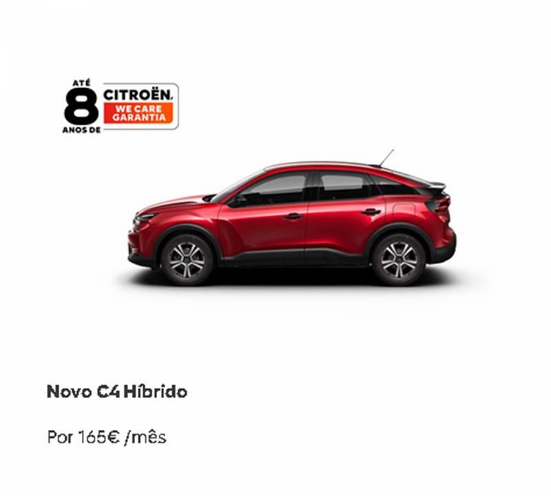 *Contrato de crédito automóvel, veículos novos para 48 meses / 40.000 km, exemplo para C4 Híbrido 110cv Automático - YOU, PVPR de 31.241,00€, PVP campanha de 25.241,00€, inclui DLTP, sem opções, entrada inicial de 5.950€, montante financiado de 19.291,00€, 47 prestações de 165€, prestação final de 16.463,86€, taxa fixa, TAN de 6,619% e TAEG de 9,1% para um MTIC de 25.364,94€ (inclui comissão de abertura de contrato de 700€, de reconhecimento e envio da declaração de extinção de reserva de 75€ e 32,50€ de custo de extinção de reserva).Condições válidas até 30/04/2026, para clientes particulares. Inclui campanha de apoio à Retoma e Desconto exclusivo ao Financiamento Stellantis Financial Services, uma marca Santander Consumer Finance, S.A., Sucursal em Portugal (registado junto do BdP com o nº 0073), nos concessionários Citroen aderentes. A Stellantis Portugal, S.A. registada no Banco de Portugal sob o nº 6803 como intermediário de crédito a título acessório, atua sem caracter de exclusividade do Santander Consumer Finance S.A., Sucursal em Portugal. Informe-se no Santander Consumer Finance S.A., suc.em Portugal."