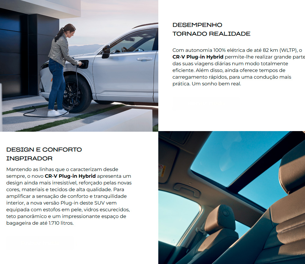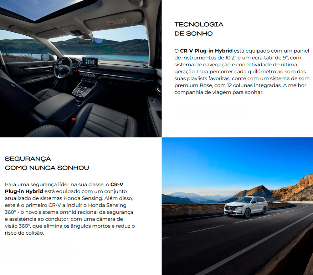 Preço chave na mão referente ao modelo Honda CR-V e:PHEV Advance Tech, incluindo despesas de legalização, transporte, pintura metalizada e ecovalor. Limitado ao stock existente nos concessionários aderentes no continente. Para as ilhas, acresce o custo de transporte marítimo. Imagem não contratual. Condições válidas para unidades em stock abrangidas pela campanha até 28 de abril de 2026. Autonomia elétrica (WLTP Ciclo combinado): 82 km. Emissões CO2 (g/Km): 0.