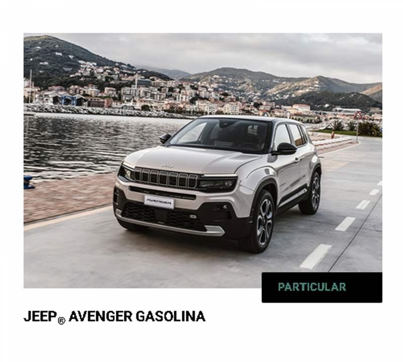 TERMOS LEGAIS: Contrato de crédito automóvel novos para 36 meses / 30.000 km, exemplo para AVENGER ALTITUDE 1.2 GSE T3 100cv MT, PVPR de 31.003,00€, PVP campanha de 23.003,00€, inclui DLTP , entrada inicial de 2.050€, montante financiado de 20.953,00€, 35 prestações de 199€, prestação final de 16.365,63€, taxa fixa, TAN de 4,095% e TAEG de 6,7% para um MTIC de 24.515,66€ (Inclui comissão de abertura de contrato de 700€, de reconhecimento e envio da declaração de extinção de reserva de 75€ e 32,50€ de custo de extinção de reserva). Condições válidas até 30/06/2026, para clientes particulares. Financiado por Stellantis Financial Services, uma marca Santander Consumer Finance, S.A, Sucursal em Portugal (registado junto do BdP com o nº 0073). A FCA Portugal, S.A. registada no Banco de Portugal sob o nº 7205 como intermediário de crédito a título acessório, actua sem caracter de exclusividade. *Valor Final Garantido, condicionado ao cumprimento de condições. Limitado ao stock existente.Jeep® Avenger gasolina: Consumo de combustível: 5,8 - 5,6 l/100 km; Emissões de CO2: 131 - 127 g/km. Valores de homologação determinados com base no ciclo combinado WLTP. Os valores indicados são para efeitos comparativos. Os valores reais de consumo e CO2 dependem de muitos fatores associados, como, a título exemplificativo, mas não limitativo, o estilo de condução, o percurso, as condições meteorológicas, de estrada, para além do tipo de utilização e equipamento do veículo.
