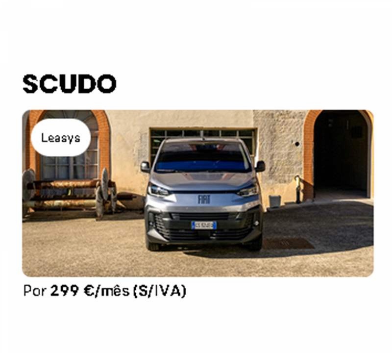 Termos legais: Campanha de Renting para Fiat Scudo 1.5 BlueHDi 120cv L2H1 - Série 3 , prazo 60 meses e 50.000 km totais, para Empresas e ENI, válida até 30/04/2026 e limitada ao stock existente. Inclui os seguintes serviços: Manutenção, Viatura de Substituição, Assistência em Viagem, Linha de Apoio ao Condutor e Impostos.Entrada Inicial 1.627,02€ sIVA. Acresce IVA à taxa legal em vigor. Imagens meramente ilustrativas. Valores sujeitos a alteração de impostos ou taxas. Para as ilhas o custo de transporte decorre por conta do Cliente e o IVA será ajustado à taxa em vigor. A presente proposta não confere relação contratual e depende de prévia análise de crédito e validação por parte da Leasys.