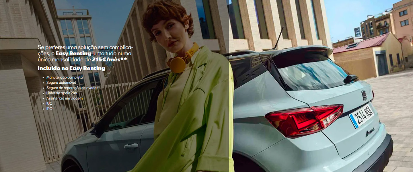 ** Campanha em Renting (Aluguer Operacional) para SEAT Arona 1.0 TSI Style 95cv. Entrada Inicial de 8.118€. Contrato para 60 meses e 50.000 km através da marca registada e licenciada SEAT Financial Services, comercializado pela Volkswagen Renting Unipessoal, Lda. Acresce 125,00€ de comissão de abertura. Inclui manutenção completa, IUC, IPO, assistência em viagem, linha de apoio ao condutor 24 horas, seguro de avarias e seguro com danos próprios com franquia 4%. Campanha válida para particulares até 30/04/2026. Limitado ao stock existente. Imagem não contratual. Consumo (l/100km): 5,3. Emissões CO2 (g/km): 121 (WLTP). A idade é uma atitude.