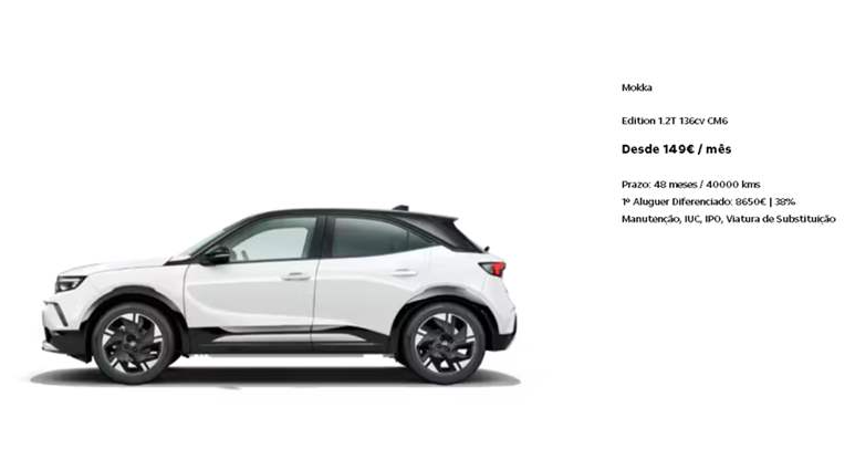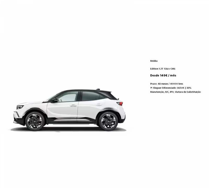 Exemplo para Mokka Edition 1.2T 136cv CM6; inclui despesas de legalização, transporte e preparação, Sem Opções, em Aluguer Operacional de Viaturas a 48 meses e 40000 km. 1º aluguer diferenciado de 8650,00 €. Exclusivo para clientes particulares. Aluguer Mensal inclui IUC, IPO, Manutenção, nos termos do contrato de Renting, condicionado à aprovação da Stellantis Financial Services, uma marca Santander Consumer Finance, S.A., Sucursal em Portugal. Não incluído: Seguro obrigatório.Condições válidas até 31 de Dezembro de 2025, nos concessionários Opel aderentes. Imagem não contratual. Emissões WLTP (117-141 g/km); Consumo combinado WLTP (5,2-6,2 l/kms).
