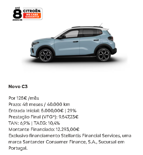 Contrato de crédito automóvel, veículos novos para 48 meses / 40.000 km, exemplo para C3 Turbo 100cv Manual - YOU, PVPR de 17.293,00€, PVP campanha de 17.293,00€, inclui DLTP, , entrada inicial de 5.000€, montante financiado de 12.293,00€, 47 prestações de 125€, prestação final de 9.547,23€, taxa fixa, TAN de 6,900% e TAEG de 10,4% para um MTIC de 16.461,60€ (inclui comissão de abertura de contrato de 700€, de reconhecimento e envio da declaração de extinção de reserva de 75€ e 32,50€ de custo de extinção de reserva).Condições válidas até 31/12/2025, para clientes particulares. Inclui campanha de apoio à Retoma e Desconto exclusivo ao Financiamento Stellantis Financial Services, uma marca Santander Consumer Finance, S.A., Sucursal em Portugal (registado junto do BdP com o nº 0073), nos concessionários Citroen aderentes. A Stellantis Portugal, S.A. registada no Banco de Portugal sob o nº 6803 como intermediário de crédito a título acessório, atua sem caracter de exclusividade do Santander Consumer Finance S.A., Sucursal em Portugal. Informe-se no Santander Consumer Finance S.A., suc.em Portugal."