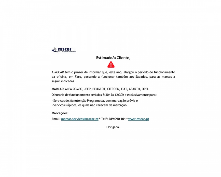 A MSCAR tem o prazer de informar que este ano, prolonga o período de funcionamento da oficina, em Faro, passando a funcionar também aos Sábados, para as marcas a seguir indicadas: